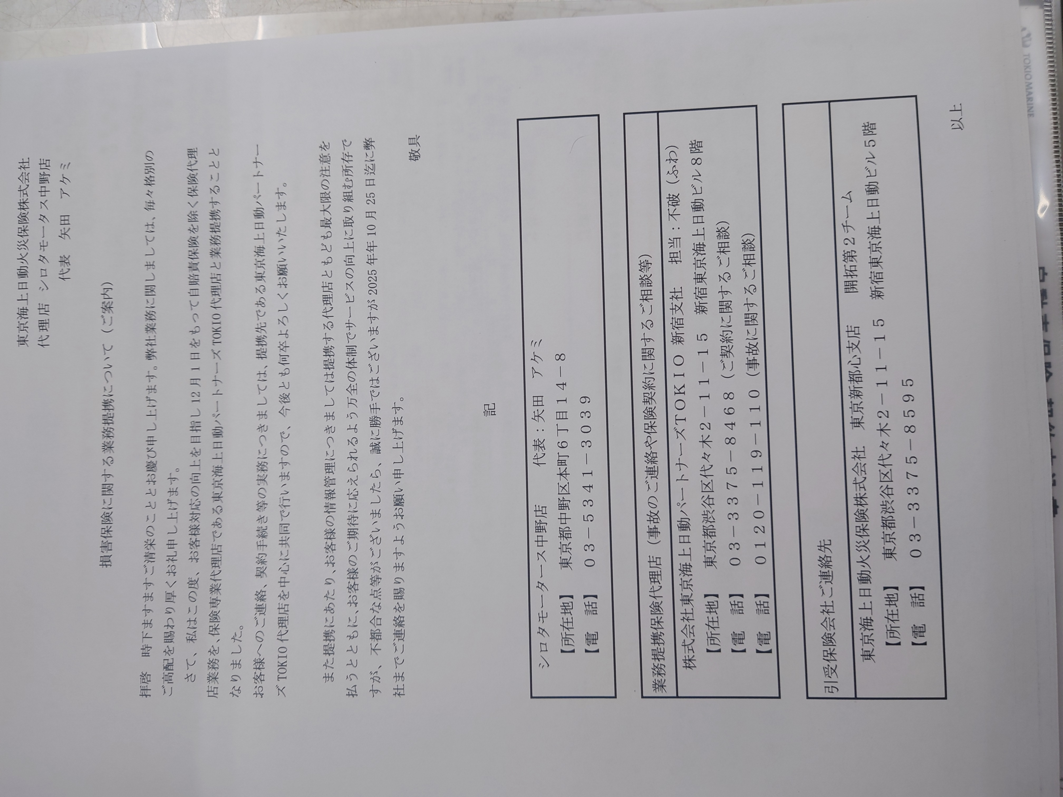 当店で任意保険にご加入のお客さまにはこの2〜3日のうちに、この手紙(添付の)が届くかと思います